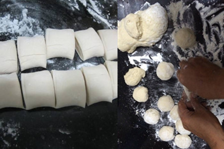 6、面团醒发好后,这时候我们会发现上面有很多的网眼。把面团再次摆在菜板之上,用手均匀地揉搓来排出里面的气体。紧接着把面团揉成条状,用刀切成等量大的面剂子。