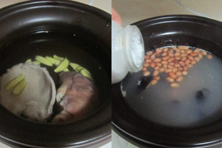10分钟后,取出煮好的猪肚,稍稍晾凉,切成大块。将煮好的猪肚重新放入砂煲,加入姜片和适量水,加盖,按下煲汤键,炖2.5个小时。当煲汤煲到2个小时后,捞出猪肚,切成细条,将一半猪肚重新放回砂煲,再依次放入木耳和花生,继续炖汤。大约还剩10分钟的时候,调入适量胡椒粉和盐即可。