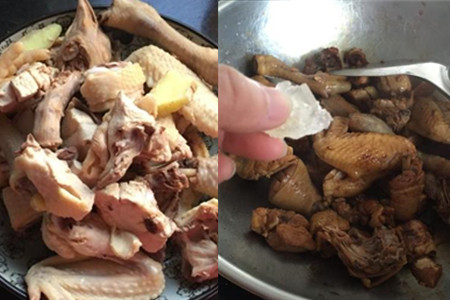 整鸡处理干净,斩成大块。煮锅洗净上灶,放入凉水,将鸡块下凉水,加入姜片和料酒,大火煮开后捞出冲洗掉表面的浮沫。炒锅洗净擦干,置于灶上,将鸡块放进锅中煸炒。鸡块炒干水分后,烹入适量料酒、老抽和生抽,放入一块冰糖,兑入足量开水,大火烧开后转成小火。