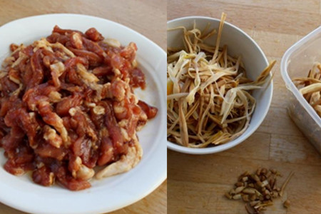 黄花菜用手撕成细丝,口感更好,这步千万不能跳过。要想把肉丝炒得很嫩,炒制的时候动作要快,炒制刚好没有血色即可。