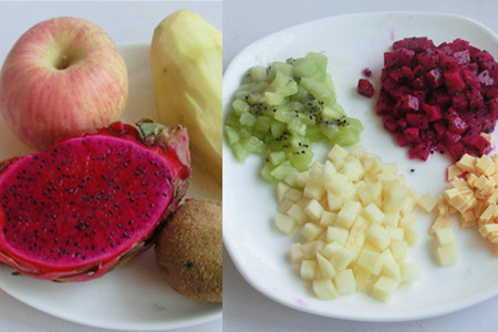 2、先将买回来的新鲜的火龙果和猕猴桃削掉果皮,用刀切成小丁。苹果削皮去掉果核,同样切成小丁状。奶酪从冰箱取出,切成丁状待用。
