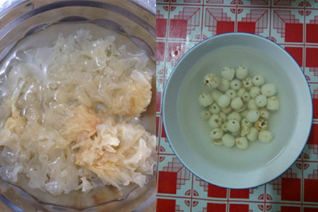 2、先将买回家的银耳泡发在装有清水的小碗里,浸泡大概一两个钟头。把泡软后的银耳捞出,用剪子剪掉根部,放在流水下冲洗干净备用。把莲子也浸泡在清水里,这样炖出来的莲子会更软烂。