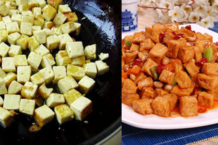 5、将适当量的食油倒进锅中,油温烧热一会后。把豆腐丁放入油锅之中,炸至表面金黄色泽便可捞出。