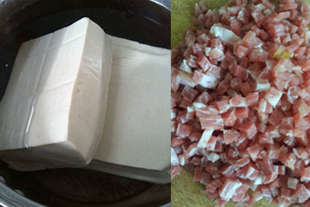 2、先将早市买回家的新鲜的豆腐浸泡在撒有食盐的清水里,浸泡上十几分钟。豆腐浸盐水,可以使豆腐更容易做成型。