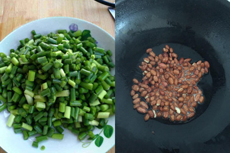 4、把炒锅加热,这时候把芝麻放入锅中,小火慢炒至金黄便可盛出盘备用。将适当量的植物油倒入炒锅里,油温稍微加热冒小泡后,把花生米下入油锅里,炸至金黄色泽便可用镂空的勺子捞出,控干多余的油分备用。
