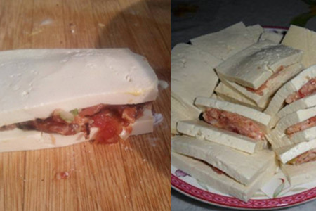 6、把豆腐切成厚片状,再将中间切开,但是不能切断。在豆腐片之中,用筷子夹入搅拌好的肉馅。肉馅的量不能夹太多,以免在烹饪过程中肉馅跑出来。