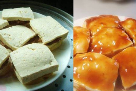 9、将少量的植物油倒入炒锅里,把蒸豆腐里面的汤汁倒入锅中。这时候再往里加入些许的老抽、生抽、白糖,大火滚开后淋上水淀粉进行勾芡。汤汁再次滚开后,把汤汁淋在豆腐上便可食用了。