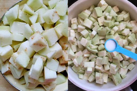 2、先将买回来的茄子择掉蒂部,放在流水里清洗干净。把茄子削掉外皮,用刀切成小丁状。把茄子丁浸泡在撒有食盐的清水,浸泡十分钟左右,再捞出挤干水分。茄子泡盐水,既可以使做出来的茄子口感更细腻,又可以减少茄子吸油的量,使它吃起来更加爽口。