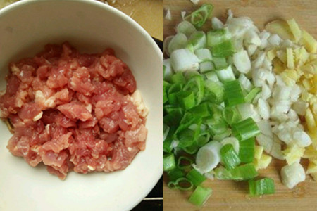 3、把猪瘦肉清洗掉上面的污血,再放在菜板之上。用刀切成小丁状,再把它全部装入一个小碗里,加入些许的料酒、食盐、淀粉进行均匀抓捏。