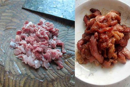 2、先将从早市场买回来的鲜瘦猪肉,放在清水之中冲洗干净表面的污血。再用菜刀切成丝状,装入一个小碗里,再往里加入些许的料酒、生抽、玉米淀粉进行均匀地抓捏,摆在一旁腌制十几分钟。