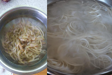 肉丝炒至变色后,紧接着把浸泡好的榨菜丝捞出,放入锅中一起翻炒。再撒上些食盐、鸡精、白胡椒粉进行调味,这时候将适当的清水倒入锅中,淋上些香油进行调味。大火烧至汤汁滚开后,把榨菜肉丝卤浇在面条上,撒些葱花搅拌一下便可食用了。