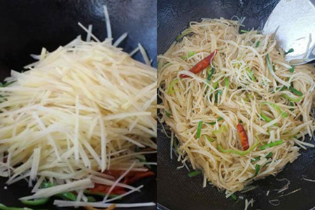 倒入土豆丝之后就可以翻炒了,再撒上味精,让味道被均匀吸收。这时候还可以加入一些调料。在土豆丝快熟的时候可以加入一点醋,注意是少许,因为我们做的不是酸辣土豆丝,只是提下味而已。然后等土豆丝熟了的时候,也就是变色了,就可以出锅了。等到出锅的时候还可以淋上生抽,这样一来颜色也就有了,看起来更加美味。