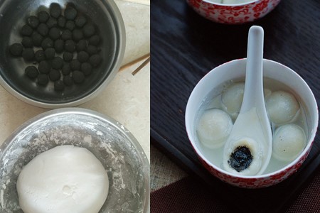 步骤二:糯米粉加入适量的水合成面团,注意这个面团要拿在手中不沾手,口感才会好。把糯米团用刀切成小块,然后搓圆压扁。用糯米皮包住黑芝麻丸,再用手搓圆即可。这样,黑芝麻汤圆就完成了。