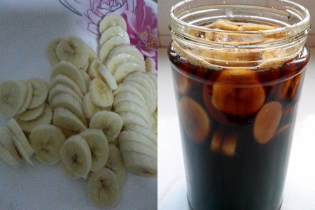 step2:拿一个密封性好的玻璃瓶,然后把香蕉片铺至底层,撒满黑糖。再铺一层的香蕉,撒上黑糖。重复这两个步骤,直至把瓶子装满,再倒入适量的果醋。放入微波炉,加热一分钟即可。两天后,香蕉黑糖醋便可以吃啦。