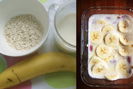 step1:把香蕉剥皮切片,然后放在即食燕麦里面。注意香蕉需要平铺在燕麦的上面。
