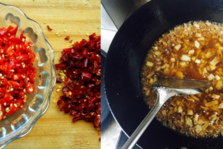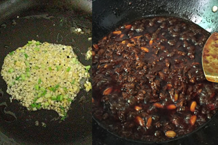 step7、待蒜末炒至金黄色后,加入少许豆豉。