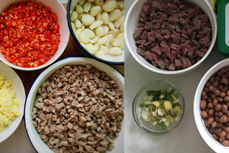 首先,准备好你所需要的各种食材,包括牛肉、香菇、黄豆酱、甜面酱、红油豆瓣酱,辣椒面、蒜、姜、花椒、白酒、白芝麻、水、油。