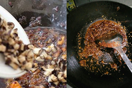 step5、热锅,随后将处理好的牛肉放入锅中。待牛肉没有水分之后,依次加入豆瓣酱和红油豆瓣酱。