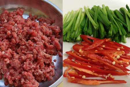 step3、对鲜姜进行处理,将其去皮后切碎。牛肉炒熟后,马上将其放入锅中,进行翻炒。