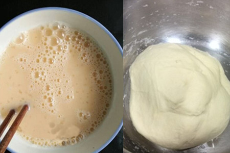 2、把面粉倒入大盆中,加入适量的白砂糖混合后,在中间拨开一个小洞,把溶解了酵母的温水慢慢地倒进去,一边倒一边用手拨动面粉。慢慢加水边揉面,直到面团可揉成面团。要掌握水量,不能太湿,太湿的面团和不成团,太干的话会让发酵缓慢。以后摸上去面团软软的但不粘手为止。