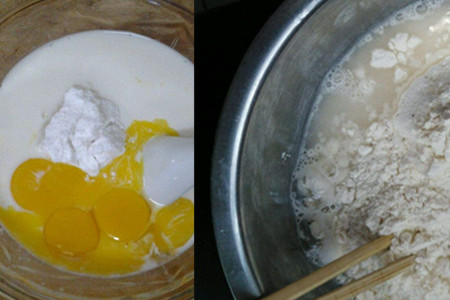 step3、对蛋黄进行处理。往蛋黄中加入事先准备好的砂糖和适量过筛的低筋面粉,待其混合成乳液后,分多次加入刚处理好的牛奶,然后继续搅拌。