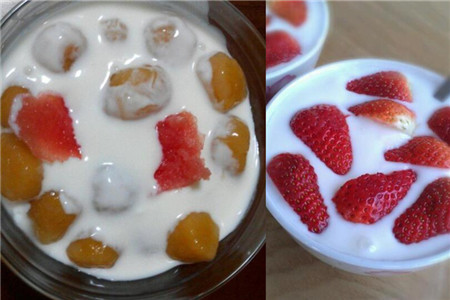 其实我们把酸奶做好了之后,还可以切一点新鲜的水果放在酸奶上面,这样不仅好看,而且吃起来口味更加的好。把芒果削皮之后切成丁放在酸奶里面搅拌均匀,或者是把草莓洗干净之后切成块儿放在酸奶里面都是可以的。