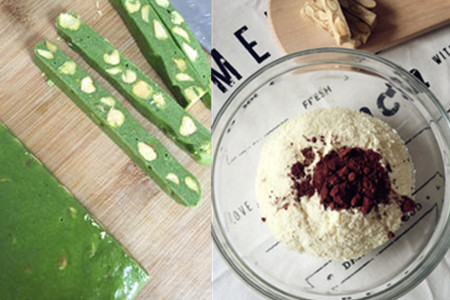 八、上面是原味牛轧糖的做法,如果您喜欢抹茶口味或者可可口味的,可以在棉花糖加热融化之后加进抹茶粉或者可可粉搅拌均匀就可以了。
