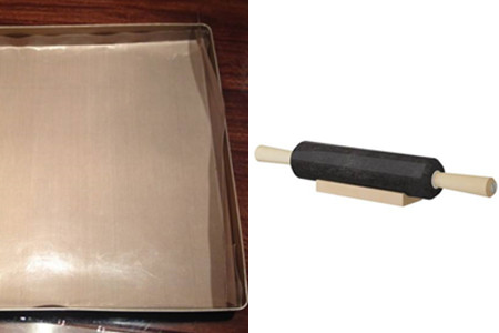 二、工具准备:平底不粘锅一个、擀面杖、平底烤盘和油布。
