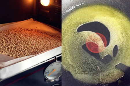 六、将准备好的坚果放进糖浆里,快速搅拌均匀。倒进铺有油布的烤盘上面,等到糖浆稍微晾凉以后就开始按压,略微平整以后用擀面杖擀成一点五公分左右的薄片。