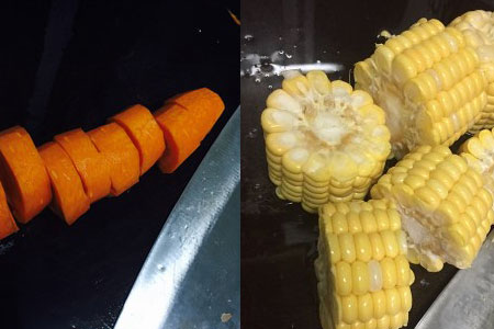 接下来是萝卜与玉米的准备,萝卜与玉米同样切段,萝卜含有丰富的胡萝卜素,玉米含有丰富的维生素,这两结合不但可以让汤更加甜美,也能补充人体内流失的维生素及营养素。