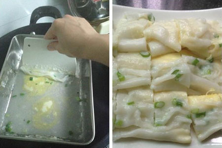 第六步,加好材料之后,就把锅盖盖上,大概过几十秒就可以出锅了。用铲子把肠粉刮下来放到盆里面,就可以看到外形如猪肠,颜色如同洁白的玉,香味诱人的肠粉了。