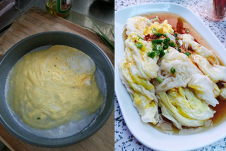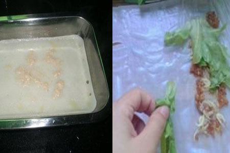 第五步,这个时候要往肠粉里面加料了,并没有严格的限制材料。喜欢吃什么的朋友就加什么吧,可以加香菇,鲜虾或者是猪肉末,还有鸡蛋,生菜,豆芽这些全部都可以加进去,来个豪华版的肠粉也是一个不错的选择呢!