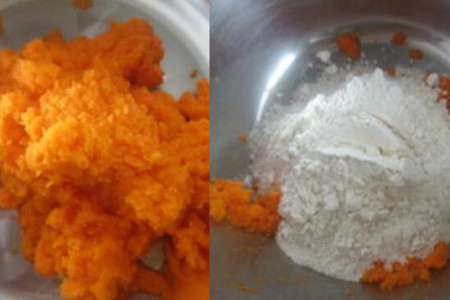 然后我们就得到了新鲜的胡萝卜汁,接着我们取出适量的面粉,将胡萝卜汁加入到面粉之中,将它们揉搓均匀,然后我们揉好的面团放在碗中,在它的表面盖上一层薄薄的塑料膜,让面团醒三十分钟,在十五分钟的时候,我们可以将面团拿出来再重新揉搓一遍。面团醒好之后,我们在砧板上撒上一层薄薄的面粉,这样可以避免面团粘在砧板上。