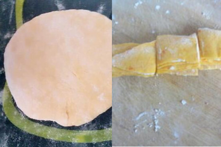 我们将面团用擀面杖擀成薄片,可以尽量的将面片擀得薄一些。面片越薄,做出来的蝴蝶面就更容易入味。接着我们将薄片用刀切成细条,大概三四条叠在一起,然后用切土豆的擦子有波浪纹的一边将面条压出花边,就可以压成波浪纹了。接着我们用筷子将面片的中间夹一下,这样我们的胡萝卜蝴蝶面就成型了。