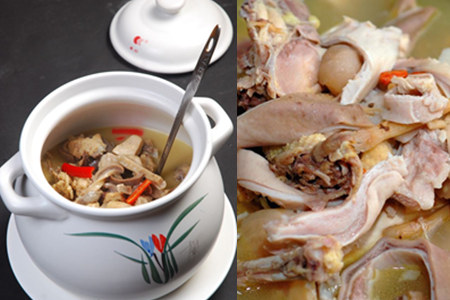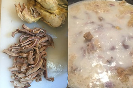 第三, 压制到一半的时候将猪肚和鸡从锅中取出,将鸡肉切块、猪肚切丝,重新放回锅中继续压制,等到肉质软烂之后,取出下到锅中,倾入高汤,调入胡椒粉煲上30min即可。