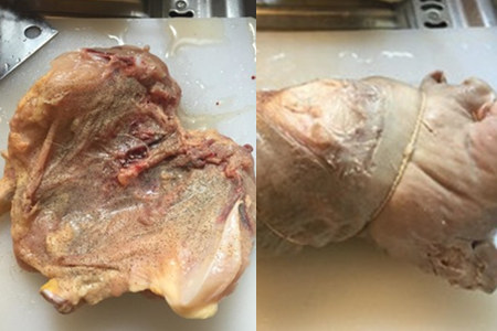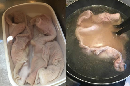 第二, 整只鸡从胸脯处对半切开,洗净血水之后抹上白胡椒粉腌制片刻;把鸡肉合起包进猪肚里,并用绳子绑紧,然后放到高压锅中压制。