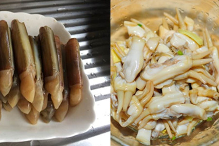 第一, 购买好新鲜的蛏子,用水浸泡上一段时间,待其吐尽沙子之后,捞起沥水,将蛏子肉取出备用。