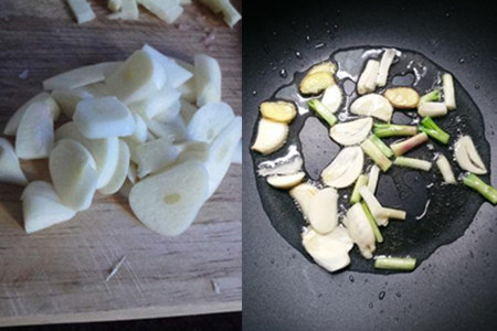 第二, 准备好大蒜和香葱,大蒜切成片状,香葱切段;起锅入油,下蒜片和葱段爆香。
