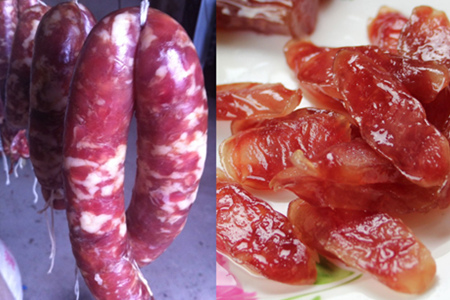 做完了上面说的几步之后,将成型的腊肠挂在干燥的地方,风干即可。食用的时候,可以蒸煮,也可以爆炒,怎样都好吃。