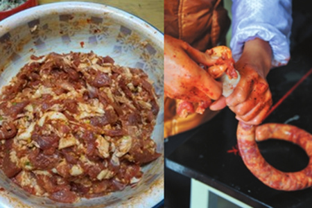 首先是选则猪肉和猪小肠。注意肉一定要肥瘦相间,而小肠要尽量厚一点。要是选用的肉里面没有一点肥肉,那么做出来的腊肠就会很柴,没嚼劲。小肠太薄了,在灌肠的时候容易破。