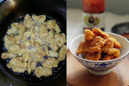 第三, 起热锅入足量的油,待到油温烧至七成热的时候,把裹好粉的肉条下锅油炸,炸至表皮金黄酥脆即可捞起沥油,放凉约5min,再将肉下锅复炸一遍,可让肉质更加的酥脆。