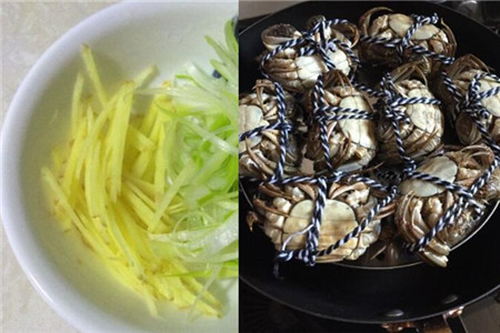 我们先把所有的醉蟹绑上绳子之后把它放在蒸笼里面,然后把我们已经切好之后的姜丝全部撒在醉蟹的上面,除了姜丝我们还要在上面撒一些花椒。我们在滴料酒时候不要滴的太多,但是我们还是尽量让每一只醉蟹上面有一些料酒。