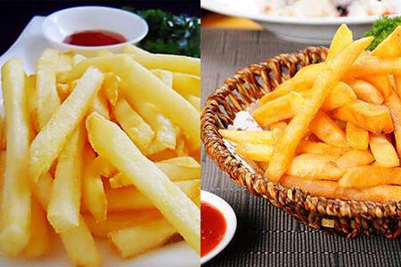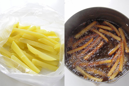 四:在锅中放入适量的植物油,烧热之后放入土豆条。等到炸至外皮金黄酥脆即可,在食用的时候蘸一点番茄酱更加的美味。