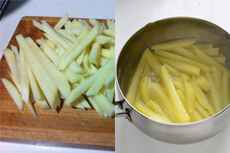 二:拿一个锅放入清水煮开,将切成条的土豆煮两分钟,然后捞出过一下冷水把水份晾干。