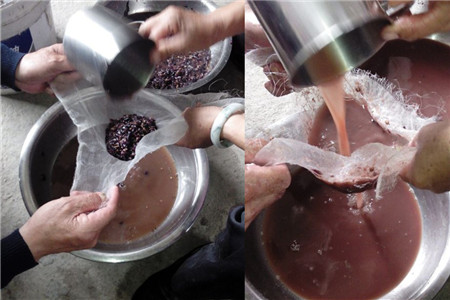 然后把分离出来的葡萄粒压扁,把里面的水分都压榨出来,也可以直接用豆浆机搅碎;接着拿出一块纱布和一个空碗,把弄碎后的葡萄用纱布过滤,把第一次过滤的葡萄汁再进行二次过滤。