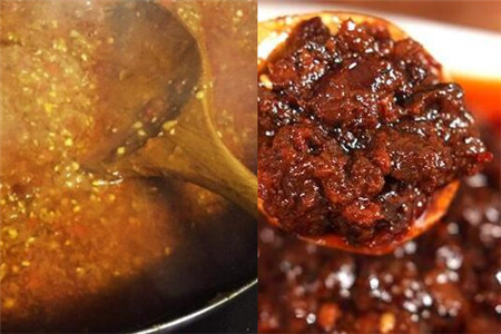 辣椒晒干之后,用刀切成小段,再用料理机将辣椒葱蒜进行研磨,辣椒研磨好之后,将其倒入不锈钢容器中,放入盐,花椒,八角等材料。同时铁锅加热,倒入植物油,此时讲究油越多越好。