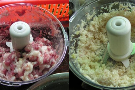 然后,就开始做猪肉玉米饺子的馅料了。先把在超市买来的猪肉切成小丁,放入绞肉器里面,搅成肉末后,用一个容器把肉末装起来放在一边;接着把绞肉器洗干净,倒入葱姜蒜等调料搅碎。