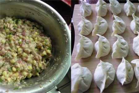 最后,一切准备好后就可以包饺子了。左手拿着面片,把饺子馅放到面皮中间位置,把一端的面皮捏紧,把后面的褶子和前面的面片粘在一起,然后重复前面的步骤,就可以做出一个带花褶子的饺子了。