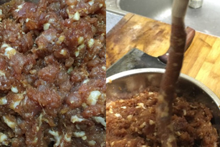 二、准备工作。将猪肉清洗干净晾干水分,切成小块之后用绞肉机绞成肉丁,您可以让超市的工作人员完成上述工作,注意不要将猪肉绞的太烂,会影响口感。事先将肠衣用温水浸泡半个小时备用。您也可以选择购买新鲜的大肠,回来之后刮掉白油,充水清洗之后就可以使用了。