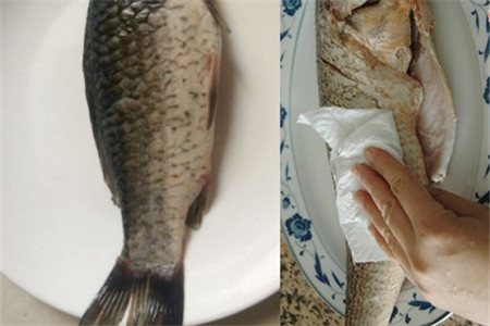 第二步:把鱼从装有料酒的碗里拿出,沥掉上面的水,之后再拿出纸巾擦拭,把表面的水擦干净后隔分钟左右继续擦,如此重复几遍直到鱼身上的水擦干净为止,大家一定要注意这一步要仔仔细细地完成,如果这一步没做好煎出来的鱼就会很容易粘锅。